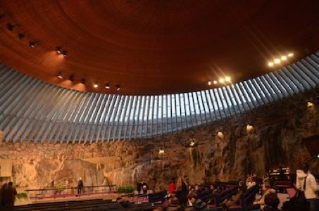 Nous regagnons ensuite Helsinki pour visiter Temppeliaukio, l’église entre les rochers, autre œuvre architecturale remarquable de 1969 des frères Timo et Tuomo Suomalainen. L’église devait être construite sur un dôme rocheux au milieu du quartier de Töölö et le projet souleva un grand nombre d’oppositions. Les architectes Suomalainen proposèrent une construction insérée entre les rochers, qui constituent ses parois, et couverte par un dôme de verre et de cuivre qui est un toit magistral.