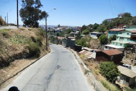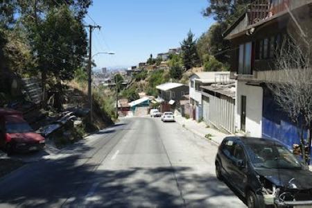Après avoir suivi la grande avenue multi-pistes qui longe le bord de mer d’une part, et le plateau du centre-ville peu séduisant d’autre part, nous atteignons l’extrémité Sud de la ville et nous élançons sur l’avenue Alemania, qui part d’abord à l’assaut de la pente avant de suivre, en serpentant aux environs de la mi-hauteur de la ville, les quartiers bariolés de Valpo comme la nomme ses ressortissants. Babar doit se faire agile et se faufiler dans des rues qui ont plus le gabarit de la 2CV que d’un camion de 14 tonnes.