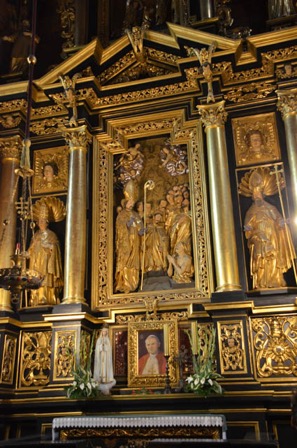Cette austérité met en évidence les aménagements colorés et dorés des chapelles. Nous nous enfonçons ensuite sous les voûtes de la rue conduisant à la grande et homogène place du marché, bordée par l’imposant hôtel de ville.