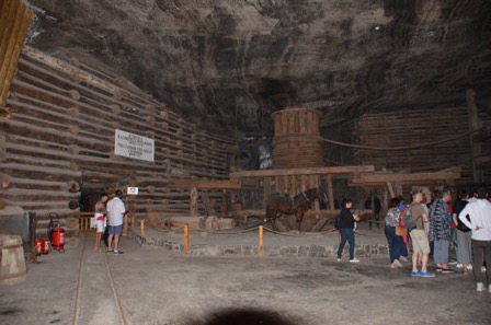 Elle comprend plus de 300 kilomètres de galerie, et 26 puits d’accès, taillés par les mineurs au fil des siècles, dont nous visitons moins de 1%. La visite commence par une descente, par un escalier en bois de 54 volées de 7 marches, à 64 m de profondeur. C’est le premier des neuf étages de galeries dont le plus profond est à plus de 300 mètres. Notre parcours traverse de nombreuse grandes salles avec des travaux de soutènement des voutes en bois impressionnant. Les machineries d’élévation des blocs de sel, avec entraînement humain ou avec des chevaux ont été soigneusement reconstituées.
