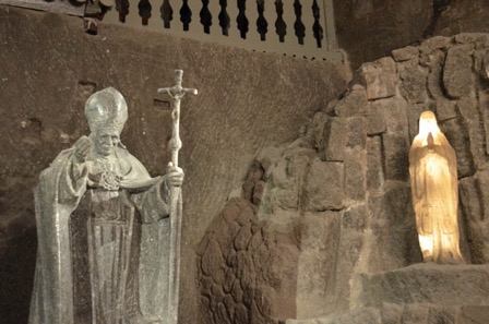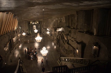 Le point d’orgue de la visite est la chapelle St-Kinga, on devrait plutôt dire la cathédrale car elle est longue de 54 mètres pour une largeur de plus de 25 mètres. Sa nef culmine à plus de 20 mètres de hauteur et supporte un immense lustre de cristal de sel. De nombreux bas-reliefs ornent ses parois dont certains réalisés par des artistes mineurs envoyés en formation à l’étranger.