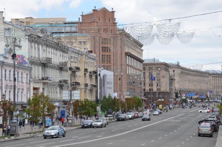 L’avenue débouche sur la place du Maïdan, bordée de bâtiments staliniens de même type. Rectangle aux extrémités semi-circulaires, de plus de 400 mètres pour une largeur de 150, la place est animée par de nombreuses fontaines et dominée par la colonne de l’Indépendance (61m), érigée en 2001 pour le 10ème anniversaire de l’émancipation du pays. A son sommet trône la statue dorée de la déesse païenne Berehinia-Oranta protectrice de la maison et de la famille. A l’autre extrémité de la place, comme pour répondre à l’idole païenne et illustrer les antagonismes ukrainiens, est érigée une statue de l’archange Michel, glaive et bouclier à la main. De beaux massifs floraux égaient cette place chère au cœur des kiéviens qui comprend des espaces commerciaux en sous-sol.
