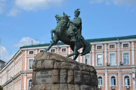 Cet hetman cosaque, héros national, conduisit la révolte de 1648 pour obtenir l’indépendance du pays sous domination polonaise. Nous allons vers la cathédrale Saint-Michel, patron des Anges, fondée en 1108 sur les hauteurs qui domine le Dniepr. Ses nombreuses coupoles dorées, visible de loin sur la rive est du fleuve, encourageaient les défenseurs de la Rous de Kiev à combattre les envahisseurs venus d’orient. Comme de nombreuses autres églises elle fut détruite par les communistes dans les années 1930, sa reconstruction selon les plans originaux s’est achevée en 2001. Elle resplendit au travers de ses coupoles et stucs de façades dorés et de superbes peintures murales.