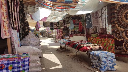 Le mécanicien-magicien des lieux y travail avec un adjoint. Il nous accueille, sous un plafond poussiéreux et en voie d’effondrement, avec bienveillance et entreprend sans tarder le travail au tour et avec une filière de M14 pas fin… Après une bonne heure d’attente le travail est fait et nous avons 6 boulons utilisables pour l’équivalent de 18 CHF. Il a bien gagné sa journée et nous avons des boulons indispensables. Le lendemain c’est dimanche et nous savourerons repos et nouvelle visite au bazar. Nous partons vers 10 heures pour une nouvelle visite dans l’un des plus grands temples du commerce d’Asie centrale avec sa quinzaine d’hectares de boutiques et de venelles couvertes. Oh surprise ! nous découvrons de nouveau secteur dans lesquels nous n’avions pas mis les pieds lors de notre première longue visite. C’est en particulier le cas d’un secteur des tissus et habits, de sortie, professionnels ou uniforme qui se prolonge dans une rue vers le Nord.