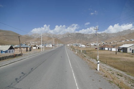 Après quelques kilomètres, un éleveur, munis d’un estagnon de lait, fait du stop. Il confirme qu’il va à Sari Tash et nous le faisons monter. Peu avant la localité nous rejoignons une bonne route, suivie par de nombreux camions de charbon, qui viennent de Karamik, au fond de la vallée avec un poste frontière fermé au trafic pour les étrangers. Compte tenu de l’épuisement de notre réserve de boulons de tête d’amortisseur, nous renonçons à partir vers le camp de base du pic Lénine et gagnons Sari Tash où nous déposons notre autostoppeur, qui va en réalité à Osh que nous n’atteindrons que demain. C’est une pratique fréquente des passagers locaux que nous embarquons de dire d’abord qu’il vont à la prochaine localité puis de demander à aller plus loin, parfois à plus de 100 kilomètres…