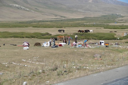 Nous remontons ensuite en direction d’Osh par le col Chiyirchik, à 2'402 mètres d’altitude, où nous trouvons un bivouac dans une région occupée par des yourtes touristiques dont la plupart sont fermées.