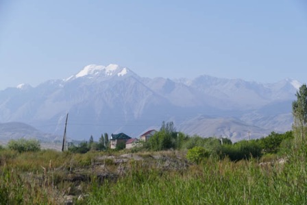 Nous décollons vers 11 heures (c’est dimanche !) pour suivre la rive sud du lac Issy Kul. Ce lac, légèrement salé et situé à 1'700 mètres d’altitude, a une longueur de 180 kilomètres, mesure 60 kilomètres dans sa plus grande largeur et dépasse 650 mètres de profondeur. Il est le deuxième plus grand lac de montagne du monde après le Titicaca. Il a une surface égale à dix fois celle du lac Léman est les itinéraires de la Route de la Soie ont suivi son pourtour, ramenant peut-être la peste noire qui décima l’Occident au milieu de XIVème siècle. La rive Nord du lac a connu un développement touristique dans la période soviétique au profit de la nomenklatura. Les hôtels étaient réservés aux cadres communistes qui étaient un peu plus égaux que les autres… La partie Est a été longtemps une base d’essai pour la mise au point de nouvelle torpilles pour la marine soviétique. L’accès au lac était d’ailleurs interdit aux étrangers jusqu’au début des années 90.