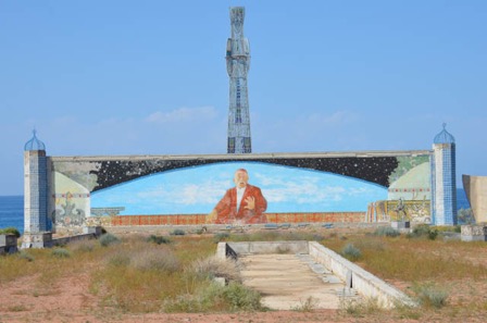 Le temps est légèrement brumeux et l’on ne voit rien à l’horizon de l’autre côté du lac qui dégage une impression de bord de mer. Aux environs du milieu de la côte Sud, entre Bökönbaev et Barksoon, nous sommes stoppés par un vétuste site touristique monumental. Il est entièrement clos par des murs et comprend deux ailes avec une douzaine de « yourtes » en béton accolées à la clôture.