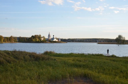 Nous reprenons la route en direction du Sud-Ouest et de Pereslavl-Zalesski. La ville (40'000 habitants) fut fondée en 1153 sur les bords du lac Plechtcheïevo (50km2) sur lequel Pierre le Grand conçu une flottille qui fut à la base du développement de la flotte russe. Nous traversons à nouveau, par une très bonne route, des plaines alternant cultures et forêts. Nous arrivons au crépuscule dans la ville que nous traversons, puis longeons la rivière Troubèje et trouvons un bivouac 300 mètres avant son embouchure dans le lac, marquée par l’église des 40 Martyrs. Nous sommes sur une place, à côté d’une croix, et la partageons avec de nombreux pêcheurs qui sont au bord du cours d’eau. La pêche est sans doute un complément alimentaire bienvenu pour les nombreux retraités qui s’y adonnent.