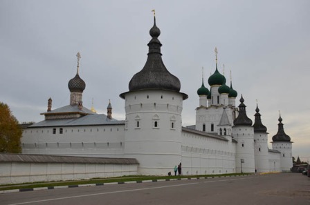Nous quittons Rostov en début d’après-midi pour parcourir une quinzaine de kilomètres en direction du monastère de Borisoglebsky. Fondé en 1363 par deux moines sous la bénédiction de Saint-Serge de Radonège. Le monastère, initialement construit en bois, fut construit en pierre et brique au début du 16ème et entouré d’une impressionnante muraille de 2 à 3 mètres d’épaisseur, de dix à douze mètres de hauteur renforcée par une quinzaine de tours. Ces fortifications, longues de près de 1,5 kilomètre, lui ont permis de résister pendant deux ans à un siège des Polonais.