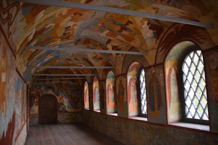 Nous commençons par les églises les plus proches du camping qui sont deux édifices « dans leur jus et non ouverts à la visite ce sont Saints Cosmas et Damien, et juste à côté, l’église d’hiver de la Sainte-Croix. Les particularités hivernales du pays empêchent de chauffer les grandes et hautes églises et celles-ci côtoient souvent des édifices plus petits, et plus faciles à tempérer, qui sont utilisés pendant l’hiver. Nous longeons ensuite la rivière en admirant les épais et hauts murs du monastère de Saint-Euthyme, fondé en 1352 par le Prince de la ville Boris Constantinovitch. Des bâtiments d’origine en bois il ne reste rien et les constructions actuelles datent du 16ème et 17ème siècle.