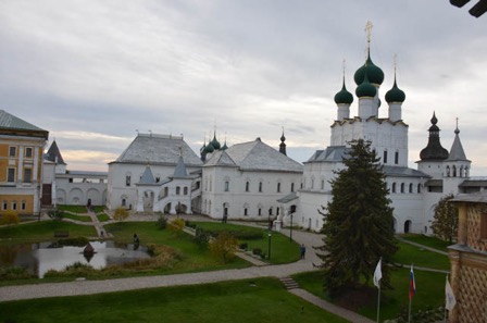 Rostov est une des plus anciennes villes de Russie, fondée sur les bords du lac Nero qui couvre une cinquantaine de kilomètres carrés. Avant sa colonisation, peu avant l’an 1'000, par les anciens slaves sous l’impulsion de Vladimir Ier, Prince de Kiev et Novgorod. La région était occupée par une ethnie finnoise, les Mériens. La christianisation des populations locales, dont Rostov était la base, dura plusieurs décennies. Un siècle plus tard, la capitale de la principauté de Vladimir-Souzdal fut déplacée vers cette dernière ville. Rostov resta cependant un centre religieux important qui se renforça particulièrement au 17ème siècle sous l’impulsion du métropolite (évêque) Sysoevitch qui tint la crosse de 1652 à 1690 et fut l’un des plus grands bâtisseurs d’édifices religieux. Il avait une influence considérable et dépendait directement du patriarche de Moscou, chef de l’église orthodoxe, qu’il assistait souvent. Sa résidence fut ainsi construite, à côté de la cathédrale existante, comme une forteresse, même si ce modèle était déjà désuet à l’époque. Un siècle plus tard, le siège du métropolite fut déplacé à Iaroslavl et le kremlin perdit de son intérêt et fut laissé à l’abandon. Cependant au 19ème siècle les moyens financiers de riches marchands de Rostov permirent une première rénovation et l’ouverture d’un musée. La signification religieuse des bâtiments s’étant estompée, ils échappèrent aux destructions bolchéviques mais furent fortement par un ouragan en 1953.